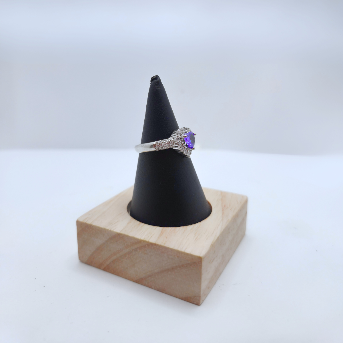 Diseño: Elegante anillo con una deslumbrante circonita central en forma de corazón de color púrpura intenso, rodeada por un halo y una banda adornada con pequeñas circonitas brillantes.