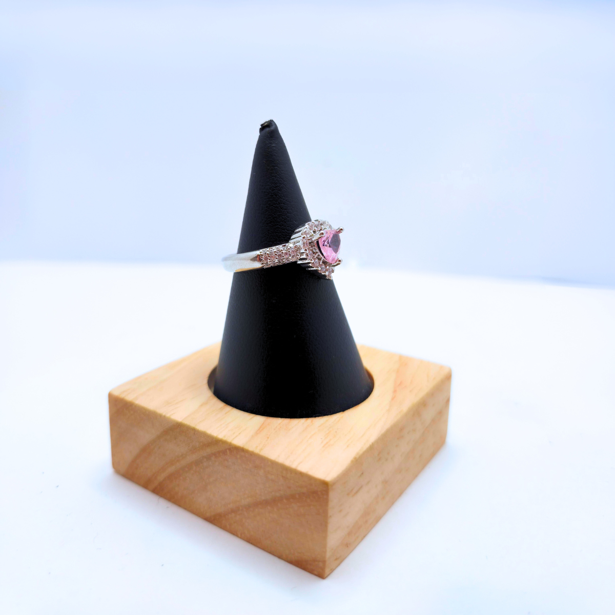 Diseño: Elegante anillo con una deslumbrante circonita central en forma de corazón de color rosa, rodeada por un halo y una banda adornada con pequeñas circonitas brillantes.