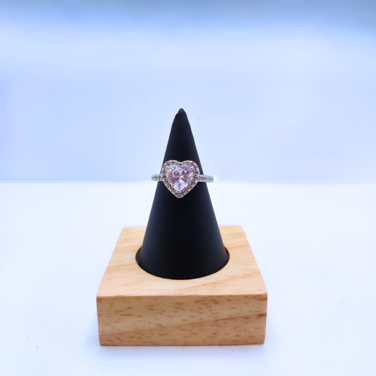 Diseño: Elegante anillo con una deslumbrante circonita central en forma de corazón de color transparente, rodeada por un halo y una banda adornada con pequeñas circonitas brillantes.