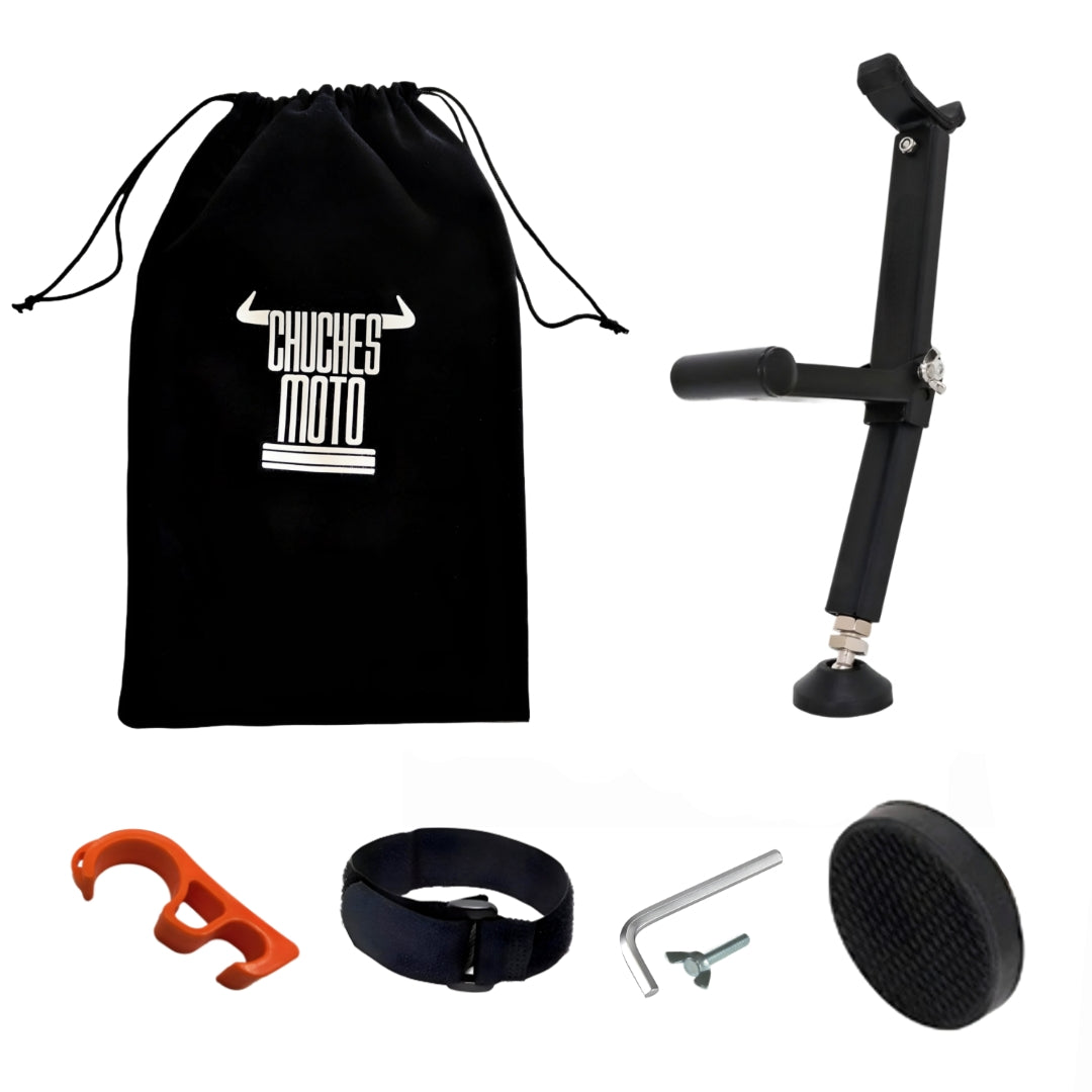Este caballete es universal, se puede usar en el eje trasero de cualquier moto e incluso sobre el eje delantero de aquellas motos que cuenten con un apoyo para levantarlas sobre este eje.