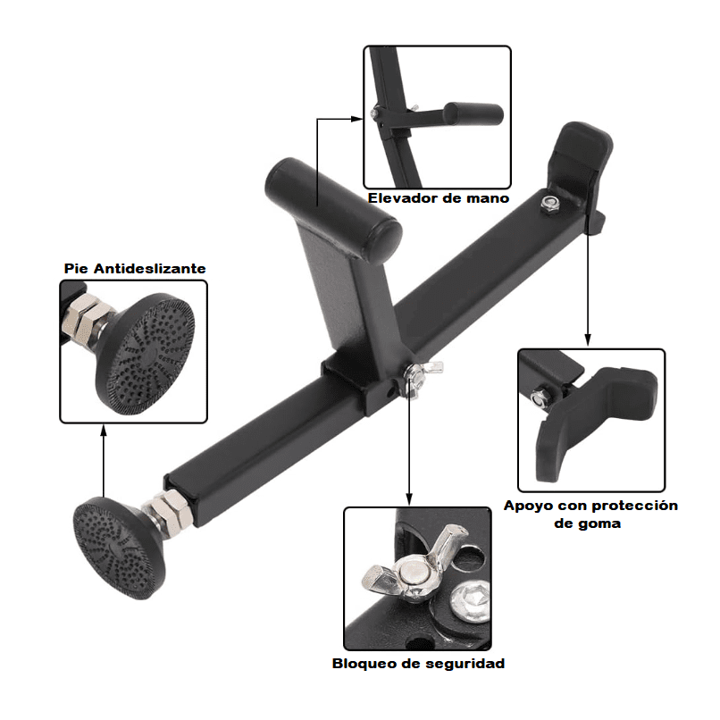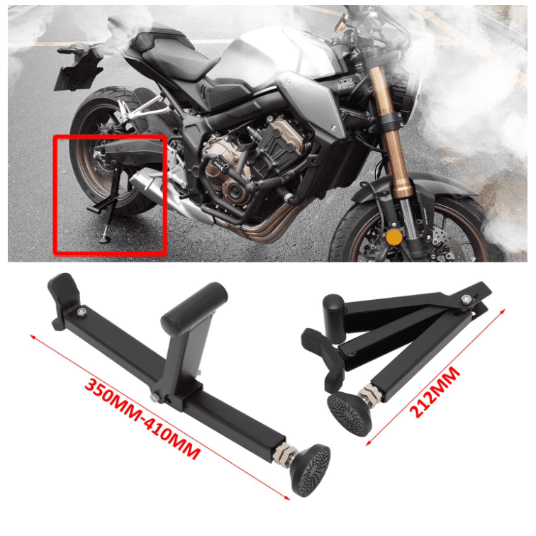 Este caballete compacto y portátil es ideal para elevar la rueda trasera de tu moto y poder realizar mantenimientos a la cadena, cambio de kit de arrastre, reparar pinchazos, limpiar la llanta o incluso retirarla para cambiar el neumático. Está diseñado para aquellas personas que no tienen espacio en su casa para guardar un caballete convencional o para quienes necesitan portabilidad.