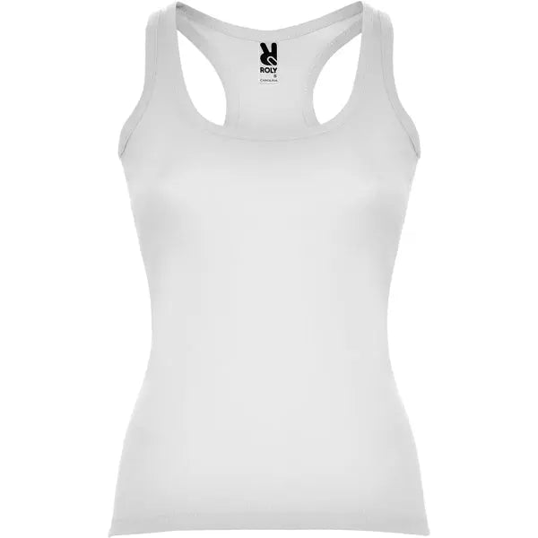 Camiseta entallada, con sisas y escote ribeteado, ancho y enrollado. Espalda estilo nadadora y costuras laterales.
