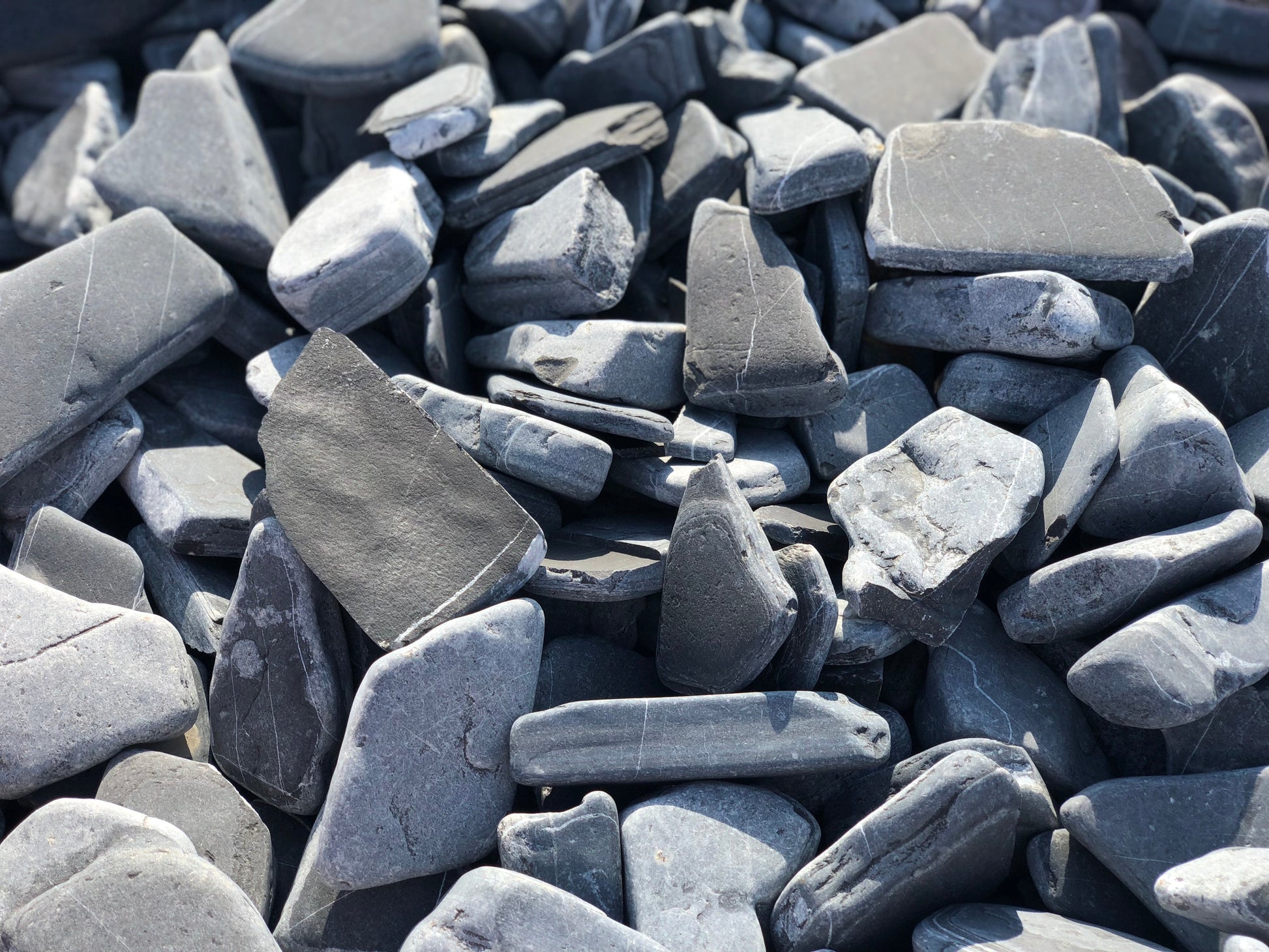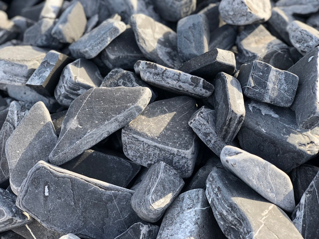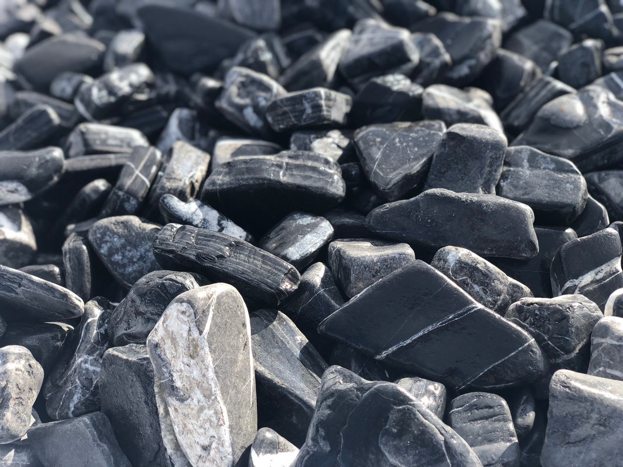 Canto Rodado Laja de tono negro o gris muy oscuro con veta blanca y formas planas de fractura en laja, un producto exclusivo de Vetonek.