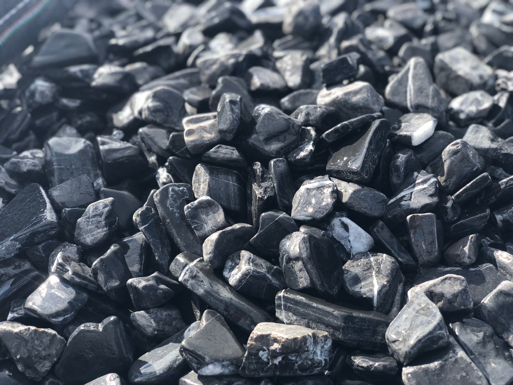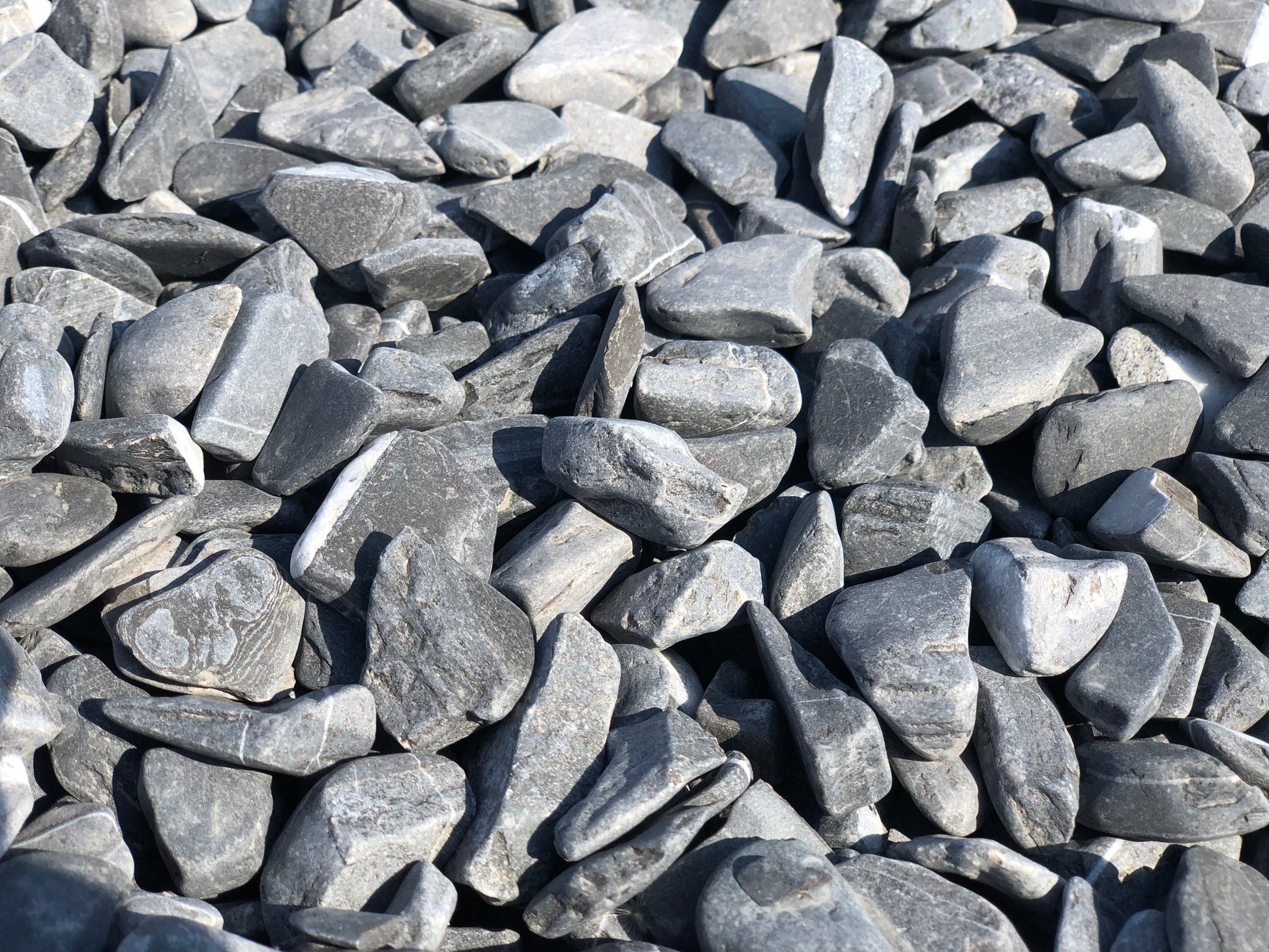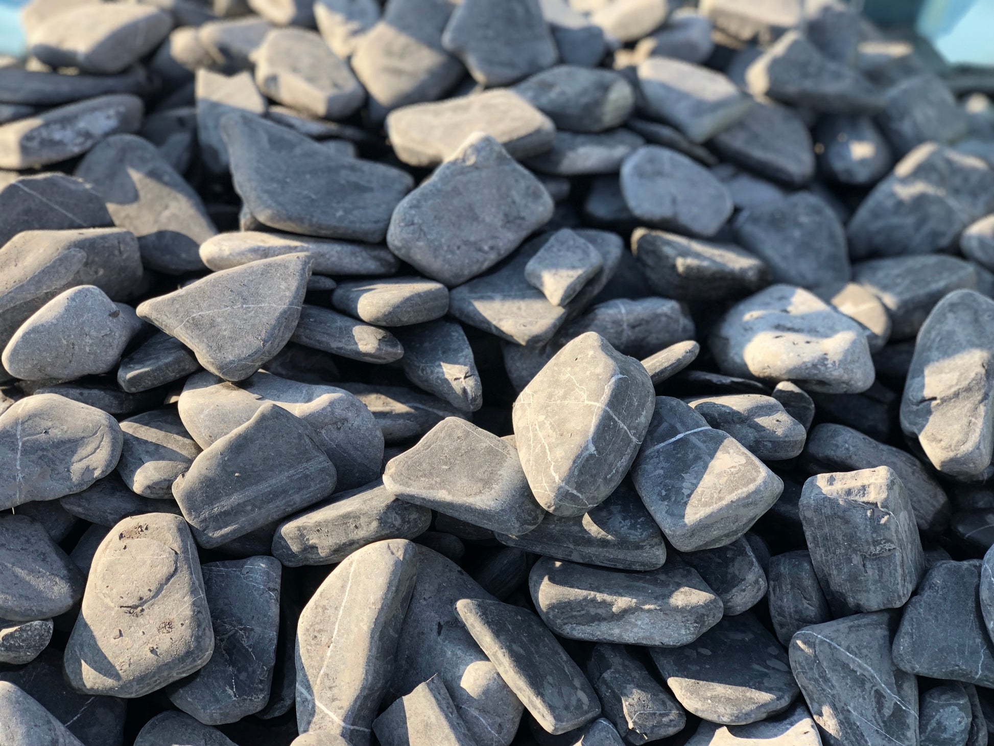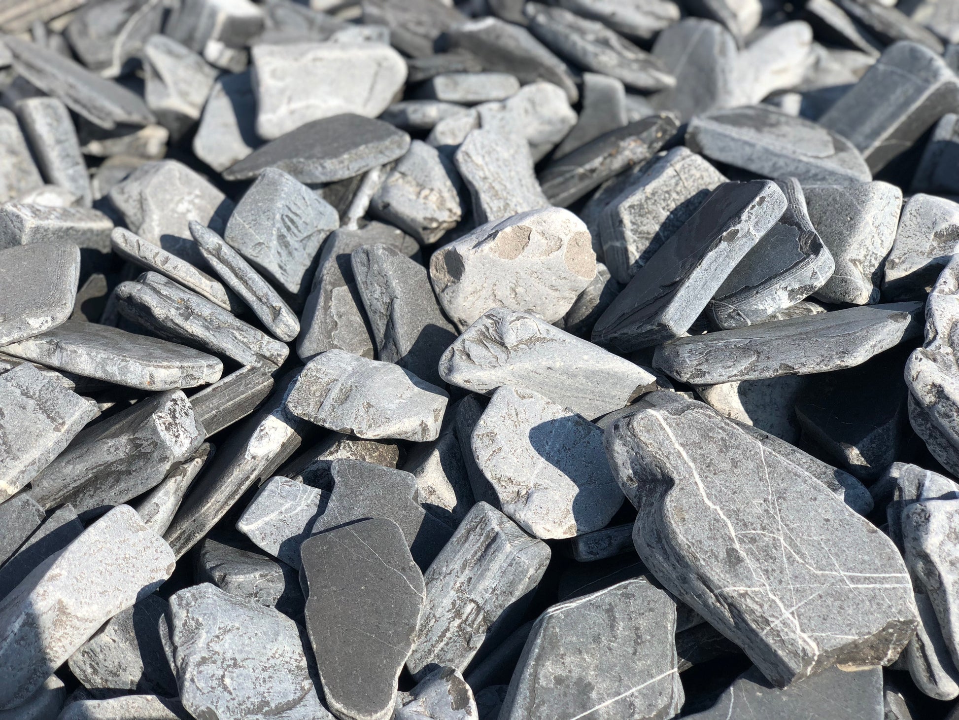Canto Rodado Laja de tono negro o gris muy oscuro con veta blanca y formas planas de fractura en laja, un producto exclusivo de Vetonek.