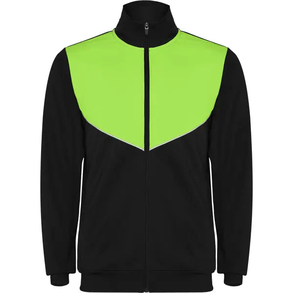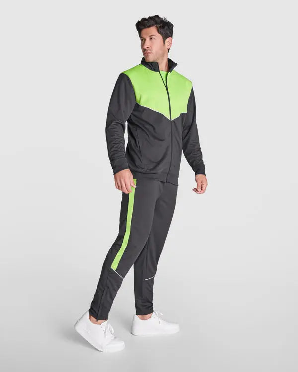 Chándal en tejido ligero y elástico. Chaqueta con pecho a contraste de color y vivo. Cuello alto con cubrecosturas a contraste. Cremallera central. Bolsillos laterales. Puños y cintura en canalé 2x2. Pantalón con cintura elástica y cordón de ajuste. Pieza lateral a contraste con vivo. Bajo con cremallera.