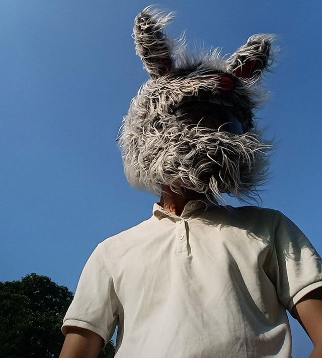 Funda de Conejo Peludo para casco de moto. Cuenta con orejas largas, ojos, nariz y dientes.