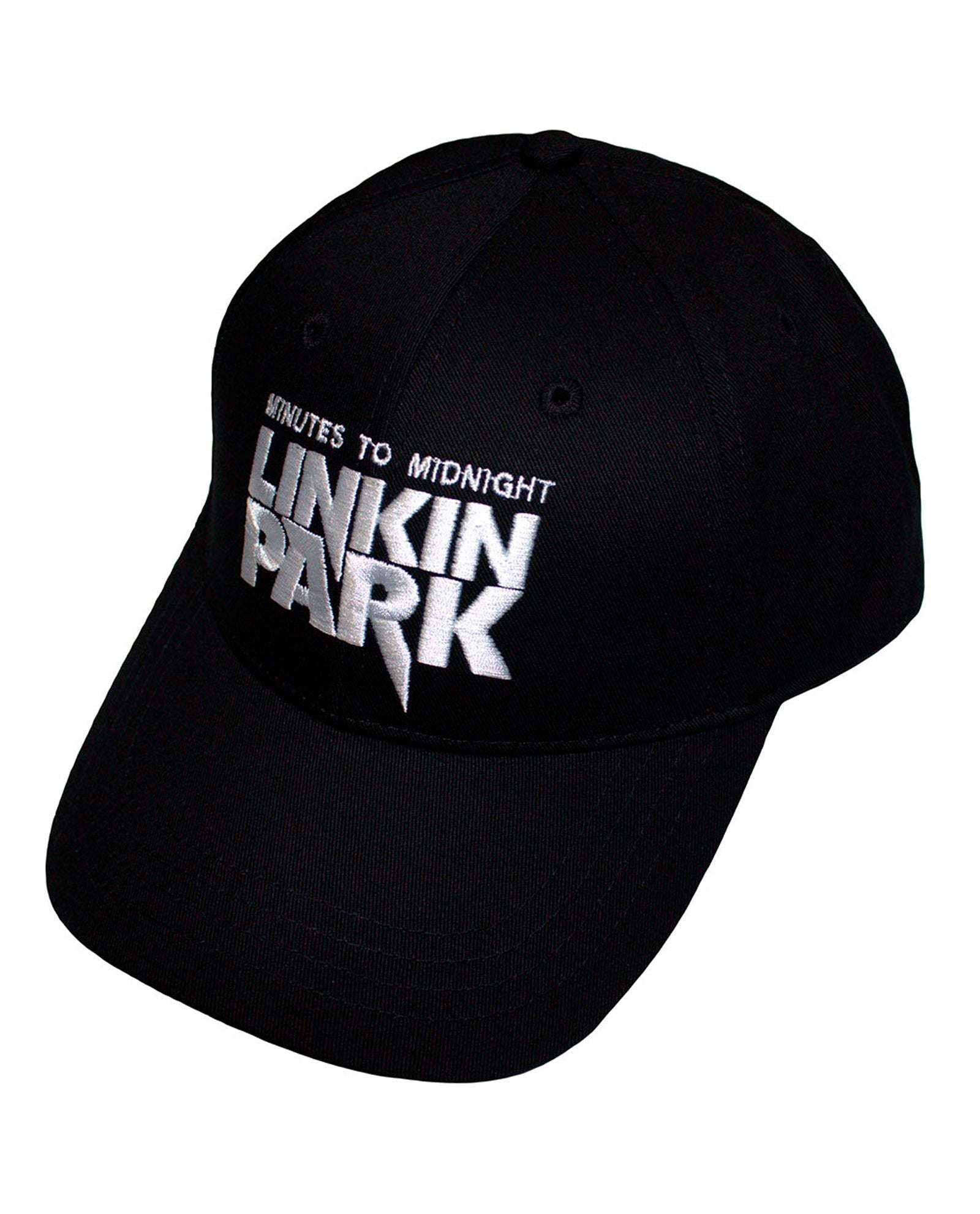 Gorra estilo Béisbol ajustable 100% oficial de Linkin Park que presenta el motivo de diseño "Minutes To Midnight" en bordado 3D. Esta gorra de alta calidad está disponible en color negro.