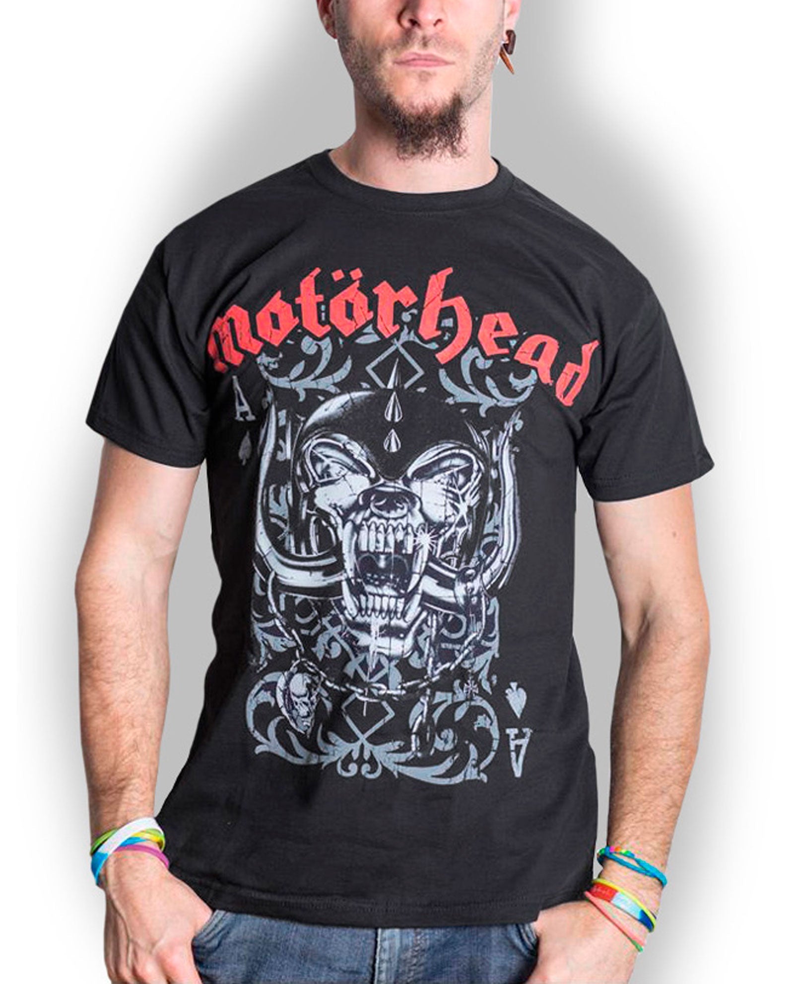 Camiseta de manga corta, cuello redondo y corte unisex. Merchandising 100% oficial de Mötorhead que presenta el diseño  "Playing Card" en la parte delantera. Esta camiseta de algodón de alta calidad está disponible en color negro.