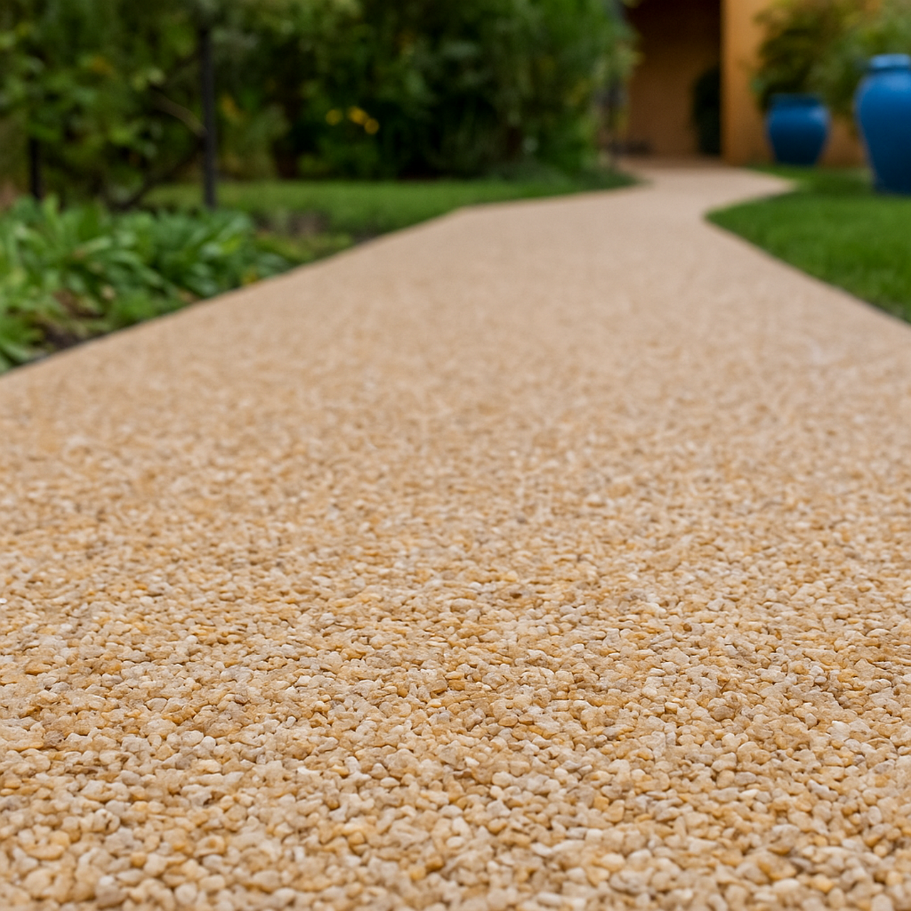 Esta resina garantiza que el árido quede firmemente fijado y compactado, creando un pavimento poroso que permite una excelente absorción de agua. Está diseñada para ser resistente a la intemperie, asegurando su durabilidad y funcionalidad en exteriores.